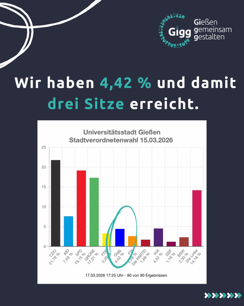 das vorläufige Ergebnis der Wahl liegt nun vor: mit 4,42% der Stimmen haben wir drei Sitze in der Stadtverordnetenversammlung geholt. Vielen Dank an alle, die uns im Wahlkampf so tatkräftig unterstützt haben und natürlich auch an alle Wählerinnen und Wähler!!!