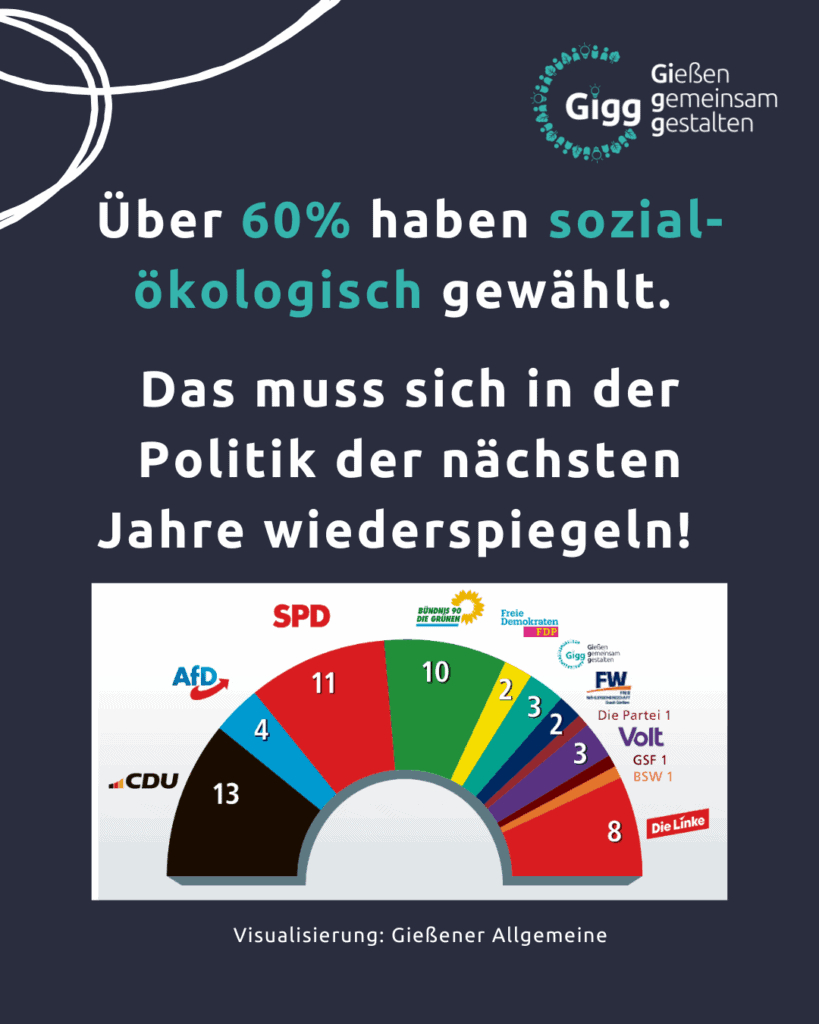 Wenn wir den Blick aber etwas weiten, stellen wir fest, dass es in Gießen weiterhin eine deutliche und stabile 60%+ Mehrheit für eine sozial-ökologische Politik gibt. Die bürgerlich-konservativen Parteien haben trotz der minimalen Zugewinne der CDU (+1,1%) insgesamt sogar verloren. Wir erwarten daher, dass diese Mehrheitsverhältnisse links der Mitte auch in den Koalitionsgesprächen und dann in der neuen Legislatur in konkrete Politik umgesetzt werden.